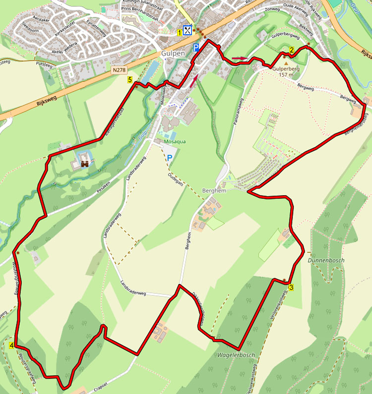 Tijdens deze heuvelachtige en panoramische wandeling klimt u eerst omhoog naar de Gulperberg vanwaar u een prachtig uitzicht heeft. Dan loopt u door een prachtig dal naar de afgelegen Gerardushoeve en dan omhoog door het bos naar Berghem. De terugweg gaat door bossen en met een mooi panorama omlaag naar het prachtige kasteel Neubourg. Onderweg staan enkele zitbanken.
