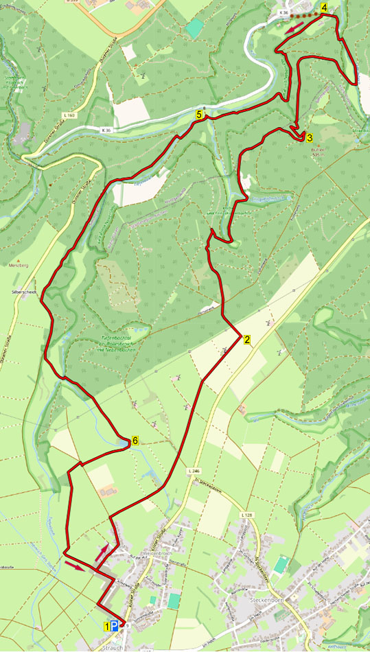 Diep verscholen in de bossen van Hürtgenwald, liggen in het dal van de Kall, de kleine Eifeldorpjes Simonskall en Strauch. Tijdens deze Eifeltocht wandelt u, door velden langs windturbines, na een tijdje langs de Kall en dan loopt u langs de kabbelende bergbeek de Tiefenbach omhoog door het bos. U loopt langs het dorpje (punt 4) Simonskall, waaraan u een bezoek kan brengen en u wandelt door velden en gemakkelijke graspaden terug naar het dorp Strauch,
