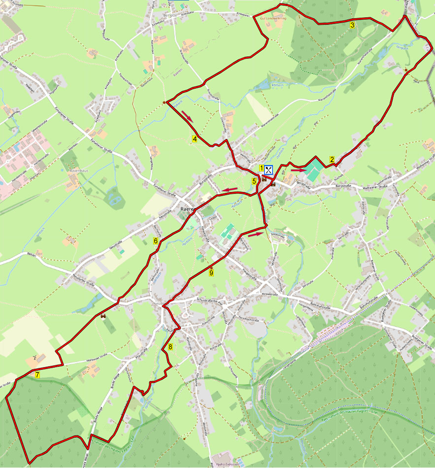 Net ten zuiden van Aken, ligt vlak over de Belgische grens in de Oostkantons (Duitssprekend) het plaatsje Raeren. Tegenover de prachtige waterburcht ligt de wandelparkeerplaats en Haus Zahlepol. Deze wandeling heeft het allemaal: Bos, weilanden, klaphekjes, nauwe doorgangen, beekjes, verrassende paadjes, uitzichten, burchten etc. De wandeling bestaat uit 2 lussen. Tijdens deze licht heuvelachtige wandeling, wandelt u eerst door weilanden langs draaihekjes en dan volgt u enige tijd een mooie hoogteweg met prachtig uitzicht. Dan loopt u het bos in en via veldwegen en door de weilanden loopt u terug naar het dorp. Na de pauze wandelt u naar de kerk van Raeren en passeert u de burcht Knoppenburg. Na een stuk door de bossen wandelt u door weilanden omlaag naar een beekje en komt u even in het dorp. Het laatste stuk wandelt u via verrassende paadjes door leuke gehuchten terug naar de parkeerplaats waar u in de burcht ook nog het pottenmuseum kunt bezoeken. Deze open wandeling gaat veel door weilanden dus hoge wandelschoenen zijn aan te raden. Bij het bruggetje bij punt 8 kan het na regenval erg nat zijn. In de route zitten geen steile hellingen. U kunt kiezen uit 3 afstanden, de route van 8,7 km start bij punt 5.