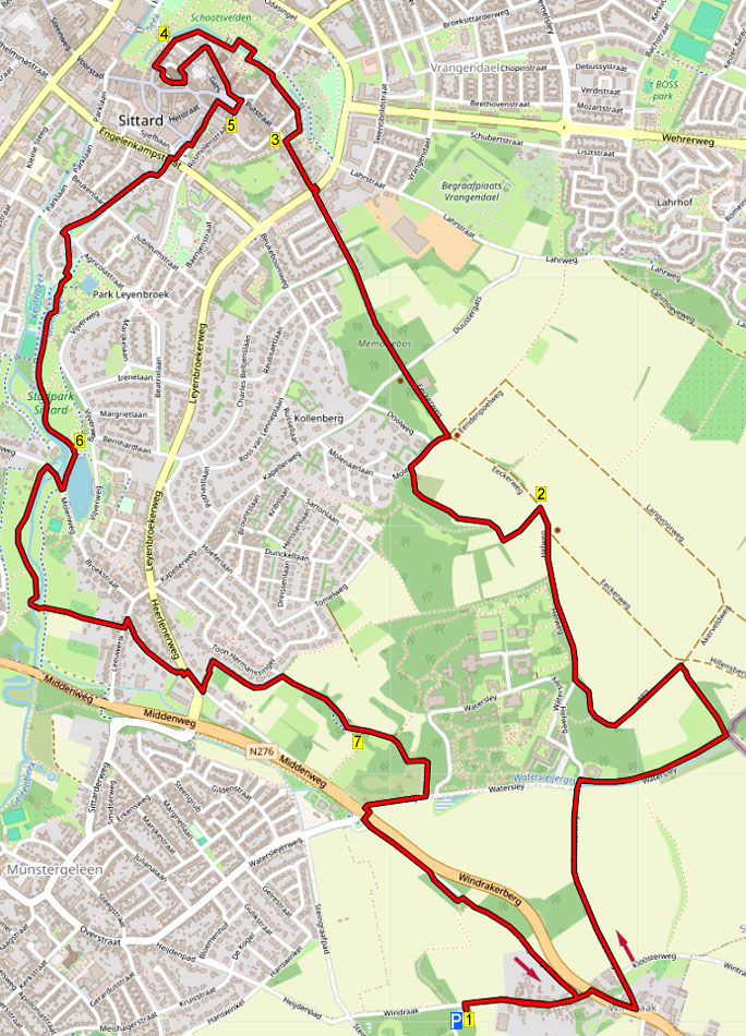 Tijdens deze gemakkelijke combinatie van stads- en natuurwandeling, leert u het mooie stadscentrum van Sittard kennen. U wandelt naar Watersley en dan klimt u naar een mooi plateau. U loopt over leuke voetpaadjes langs bosranden naar de Sint Rosakapel en dan loopt u Sittard binnen. Hier wandelt u over de stadswal, langs Fort Sanderbout en door het stadspark. In het centrum passeert u 4 kerken en dan komt u op het gezellige Marktplein. De terugweg wandelt u langs de Molenbeek, naar een groot park met vijver en watermolen en dan loopt u langs de Geleenbeek. U klimt de Kollenberg op en loopt door het bos omlaag. Via een rustig weggetje loopt u terug naar Windraak.