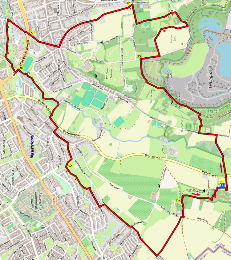 Tijdens deze heuvelachtige en afwisselende wandeling steekt u de Jeker over en dan klimt u door het Encibos de Sint-Pietersberg op. U passeert een schitterend uitzichtpunt met uitzicht op de Encigroeve en dan wandelt u door weilanden met prachtig uitzicht op Maastricht en de Maas naar het kasteeltje van André Rieu. Dan wandelt u door het stadspark van Maastricht en dan wandelt u over voetpaden langs de Jeker naar de wijk Biesland. U loopt door een hooggelegen parkje langs de wijk Campagne en dan klimt u de Cannerberg op. U volgt een leuk paadje over de Cannerberg en dan daalt u af door het Cannerbos naar de parkeerplaats van Château Neercanne. Neem zelf proviand mee er staan genoeg zitbanken.