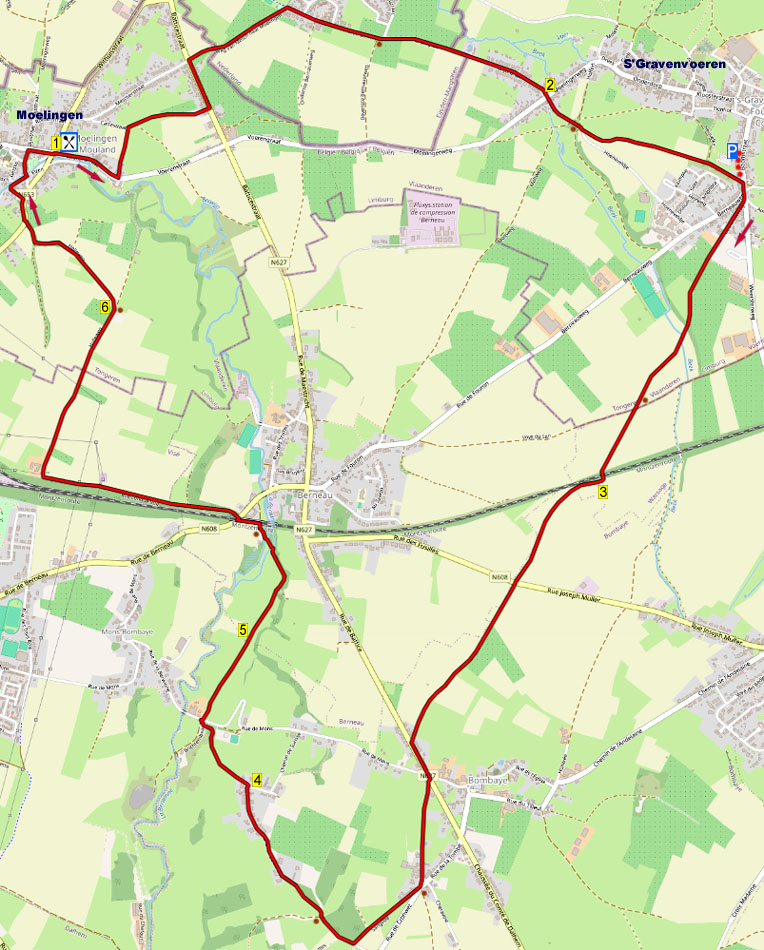 Dan wandelt u door velden naar het Dalhemerkruis en klimt u omhoog naar het Franstalige dorpje Bombaye. Via een rustig weggetje komt u in de buurtschap Surisse en dan volgt een schitterend stuk door het dal van de Berwinne. U wandelt door weilanden met nauwe doorgangen en dan steekt u de Berwinne over. Bij een hoog spoorwegviaduct klimt u naar een mooi plateau en via veldwegen wandelt u terug naar Moelingen. U kunt de wandeling ook starten op de parkeerplaats Boomstraat 29 in ’s Gravenvoeren en dan na 10 km pauzeren bij Bistro Berwien waar een leuk terras is.