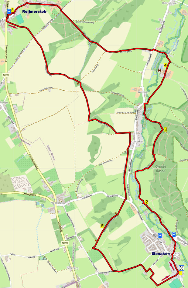 Mooie panorama’s, klaphekjes, weilanden, hellingbossen, koeien, vakwerkhuizen en twee goede horecazaken zijn de ingrediënten voor deze heuvelachtige wandeling. U wandelt eerst even door Slenaken en dan struint u geruime tijd door het prachtige Gulpdal over leuke paadjes langs de Gulp. Bij de buurtschap Waterop verlaat u het dal en klimt u naar een open plateau waar u kunt uitwaaien. Via bos- en veldwegen loopt u naar Reijmerstok. Dan loopt u over graspaadjes en veldwegen omlaag naar de buurtschap Beutenaeken en klimt u een boshelling omhoog. U struint dan een flink stuk door de weilanden en via een veldweg loopt u omlaag naar Slenaken waar bij brasserie De Zevende Heerlijkheid een mooi terras is met schitterend panorama! Ook is er een mooie serre. U kunt ook starten in Reijmerstok, daar is een grote gratis parkeerplaats en dan pauzeren in Slenaken. Bel voor de zekerheid even naar de zaak hoe laat die open is.