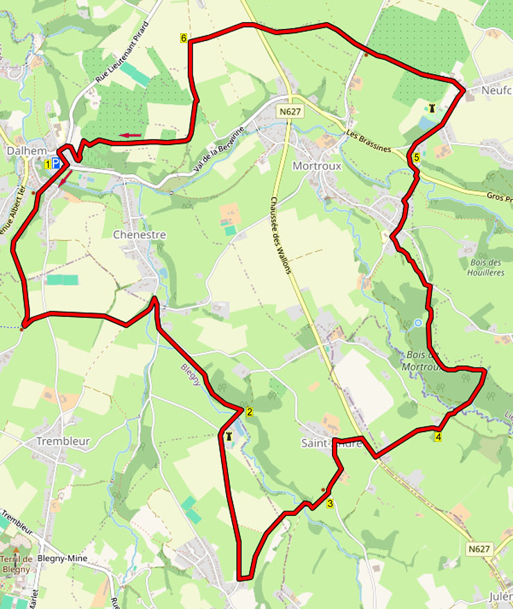 Een wandeling waar u door een echte spoortunnel wandelt! Tijdens deze wandeling, met flinke hellingen, door het Land van Herve. U start bij de verlichte spoortunnel en loopt u onder de berg door en dan volgt u een voormalig spoorwegtraject. U loopt voorbij het gehucht Chenestre en loopt u via mooi bospad naar Château Cortils en via een prachtig stuk door de weilanden komt u in het dorpje Saint-André. U daalt door weilanden af naar het beekje Rou d’Asse en u steekt de Berwinne over. U loopt door het bos Bois de Mortroux omhoog en wandelt u, een stuk over gemakkelijke paden en veldwegen, terug naar Dalhem.