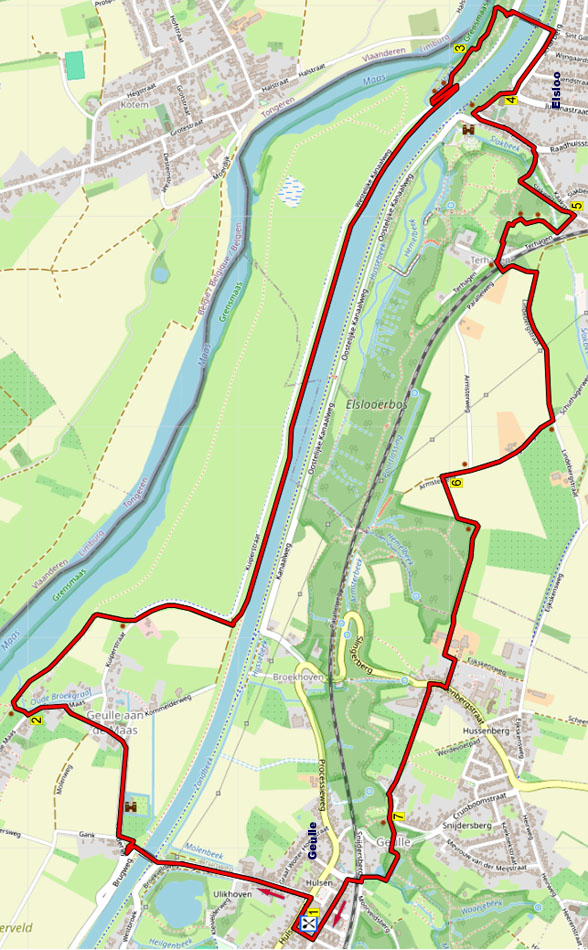 Tijdens deze gemakkelijke en afwisselende wandeling, steekt u het Julianakanaal over en passeert u het mooie Kasteel Geulle.  Voorbij de prachtige kerk van Geulle aan de Maas wandelt u over een dijk met mooi uitzicht op de Maas en dan wandelt u geruime tijd langs het Julianakanaal, waar u tevens de Maas kunt zien.  Via verrassende bospaadjes komt u bij de brug en even later wandelt u door de prachtige oude kern van Elsloo. Via het mooie kasteelpark wandelt u naar de buurtschap Terhagen en via leuke voetpaadjes loopt u naar de buurtschap Hussenberg.  Voorbij de buurtschap Snijdersberg daalt u via een mooi bospaadje af naar Geulle.