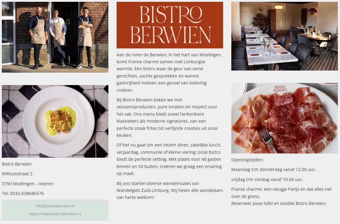 Tijdens deze gemakkelijke en grensoverschrijdende wandeling tussen twee dorpen Moelingen en ’s Gravenvoeren, u steekt  meteen de Berwinne over en klimt u via een prachtig hol pad omhoog naar een plateau. U daalt af naar het Franstalige dorp Berneau en voorbij enkele graspaadjes volgt u een lange veldweg naar ’s Gravenvoeren. Via een mooi graspaadje komt u in het centrum bij Bakkerij Equilibrium waar u fijn kunt pauzeren. U klimt omhoog naar het kerkhof en dan volgt u een betonnen pad door de mooie Voerstreek naar de buurtschap Mesch. Via veldwegen en graspaden loopt u terug naar Moelingen.  U kunt ook starten bij Bakkerij Equilibrium (punt2/3) en pauzeren bij Bistro Berwien . Kijk goed naar de openingstijden op de sites.