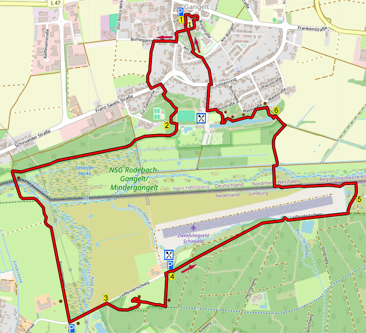 Ten noorden van Schinveld ligt het Duitse dorp Gangelt. Tijdens deze gemakkelijke en afwisselende wandeling, met halverwege een fijn terras, wandelt u via een veldweg het dorp uit en via bospaden loopt u naar de Rode Beek. Via voetpaden loopt u naar de Schinveldse Bossen en beklimt u een heuvel met boven een vijver en mooi uitzicht. Even later komt u bij Restaurant De Lier voor een pauze. Na een flink stuk door de bossen loopt u Duitsland binnen en wandelt u langs een fraaie vijver. U passeert restaurant Hamacher en dan loopt u via de begraafplaats terug naar de kerk. U kunt ook starten bij Restaurant De Lier in Schinveld, start dan bij punt 4.
