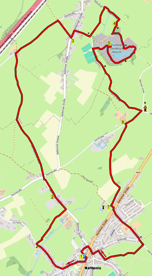 Ten noorden van de stad Eupen ligt, in Duitstalig België, het dorpje Kettenis. Doel van deze glooiende wandeling, met veel weilanden en klaphekjes, is het spectaculaire uitzicht in de groeve Steinbruch Rotsch, waar ook stenen kunstwerken staan. U loopt eerst een stuk door het dorp en dan wandelt u door weilanden, over veldwegen en een rustig weggetje naar het dorp Walhorn. Dan klimt u naar de groeve en staat u op de steilrand met mooi uitzicht op het diepe meer. U loopt verder langs de steilrand met nog meer uitzichten in de groeve en dan gaat het gestaag omhoog door weilanden tot bij Schloss Libermé. Na een stukje door het dorp wandelt u door weilanden terug naar de parkeerplaats. Het is een gemakkelijke wandeling zonder steile hellingen, maar er is wel wat hoogteverschil. In de zomer kan er in de weilanden hier en daar hoog gras staan maar nergens brandnetels. Onderweg staan ook enkele zitbanken.