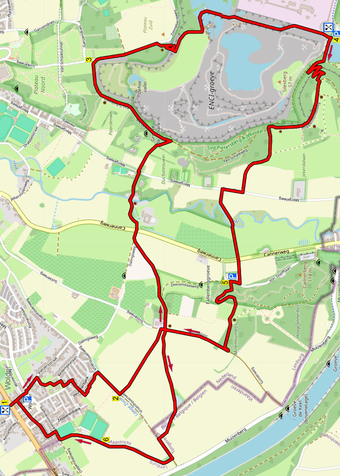 Een wandeling door de ENCI-groeve is heel spectaculair! Vanuit de Maastrichtse wijk Wolder klimt u omhoog en daalt u af naar het Jekerdal. Dan klimt u de Sint-Pietersberg omhoog en dan wandelt u naar het Pieterpadmonument en uitkijkschans, met schitterend uitzicht in de groeve. Via een lang trappenpad daalt u af naar de mergelrotsen en dan struint u door de groeve, een bijzondere ervaring. U passeert Chalet D’n Observant voor een pauze en dan klimt u weer de Sint-Pietersberg omhoog. U daalt af naar de Jeker en dan klimt u steil door het Cannerbos omhoog. Voorbij het Milleniumbos daalt u helemaal af en via een mooi pad loopt u terug naar Wolder. Tijdens de route heeft u prachtige uitzichten. Het is een pittige wandeling. U kunt ook starten bij punt 4 en dan pauzeren bij het gezellige café de Pepel. Trek er 4 uur voor uit inclusief pauze.